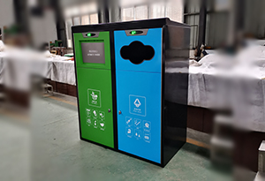 垃圾箱通過(guò)不同投放口進(jìn)行垃圾分類引導(dǎo),內(nèi)部設(shè)有壓縮系統(tǒng),用箱頂?shù)奶?yáng)能電池板供電,可自動(dòng)對(duì)投入的垃圾進(jìn)行壓縮。